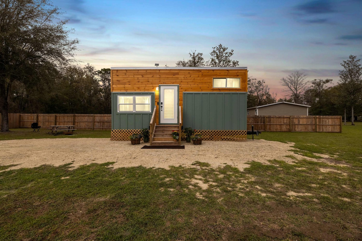 ↞------------------- Newly Built | Ganesh Tiny Home -------------------↠ ✓ Designer Quality Tiny Home ✓ 2 Miles From Ichetucknee Springs ✓ Fully Equipped Kitchen ✓ Outdoor Picnic Table and Grill ✓ Fire Pit ✓ HD LED Smart TV ✓ Complimentary Tea & Coffee Bar ✓ High speed Starlink Wifi internet ✓ Serene Getaway *Please note that sleeping spaces are accessed by stairs. This tiny home is NOT wheelchair friendly or suitable for those with a disability that would prevent them from climbing stairs.
