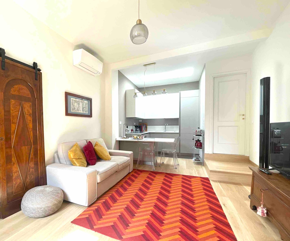 This bright attic is furnished with everything you need for a pleasant stay: a spacious kitchen with cooking utensils, an induction stove, a microwave, a Smart TV, Netflix, Wi-Fi, a Bluetooth speaker, air conditioning, a washing machine, and a comfortable double bed beneath a stunning 12th-century fresco. The entire apartment is available on the third floor (no elevator), in the city's liveliest neighborhood, just five minutes from the subway.