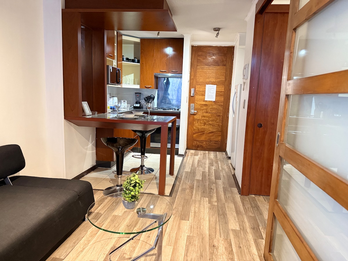 Moderno y acogedor departamento con aire acondicionado en el corazón de Santiago. A pasos del metro y del Centro Histórico, rodeado de museos, mercados y restaurantes. Cama king, cocina equipada, balcón y wifi rápido, ideal para viajes o estadías largas. Edificio seguro con conserje 24/7. Atención personalizada, check-in flexible y recomendaciones locales para que disfrutes la ciudad como un residente, con comodidad y tranquilidad.