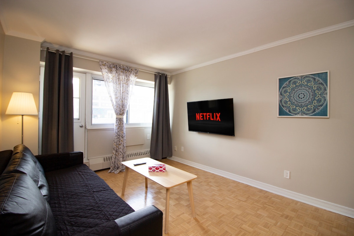 1 minut udaljen od stanice metroa. (( Guy Concordia)). u blizini tržnih centara i glavnih atrakcija u gradu. 24-satne prodavnice i apoteke. Nedavno renovirana u potpuno novoj zgradi koja nudi unutarnji bazen, teretanu i saunu. zato se slobodno opustite u ovom smještaju dok ste u svom domu s bračnim krevetom ,odličnim i udobnim kaučem, pametnim TV-om od 60 inča, Netflixom. ((parking 20 $ po noćenju pod zemljom u istoj zgradi nije uključen u najam👍🤞🏼)).