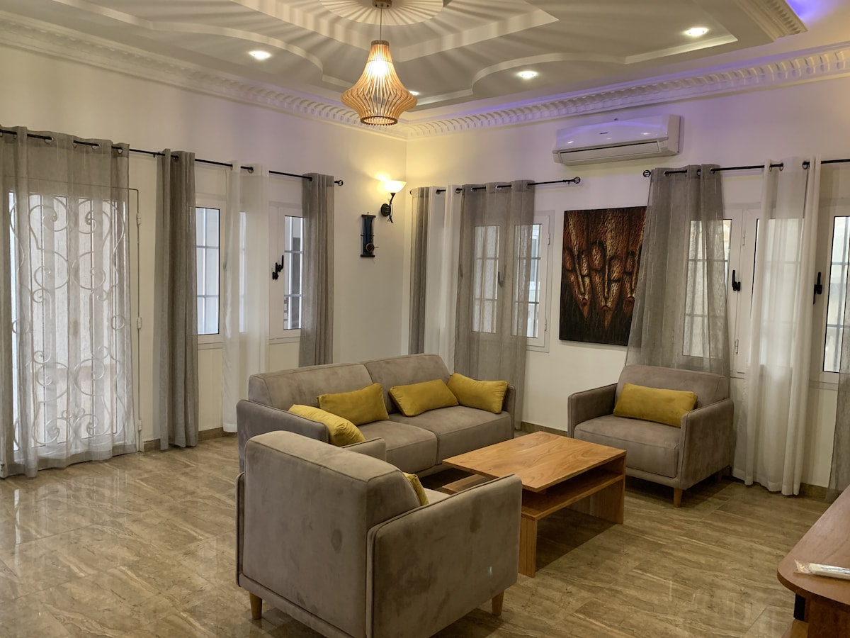 Dobro došli u ovaj moderni i prostrani studio apartman u Cotonouu, vašem savršenom domu daleko od doma u mirnom i sigurnom okruženju. Uživajte u potpuno opremljenoj kuhinji, udobnom dnevnom boravku s udobnim sofama i pametnim TV-om, trpezarijskom stolu te privatnoj spavaćoj sobi i kupatilu. Prostor je svijetao, čist i pažljivo dizajniran za opuštanje ili rad. Ovaj prelijepi stan je udaljen svega nekoliko minuta vožnje od aerodroma, u blizini su otmjeni restorani u Haie viveu, a također i u blizini supermarketa i prodavnica