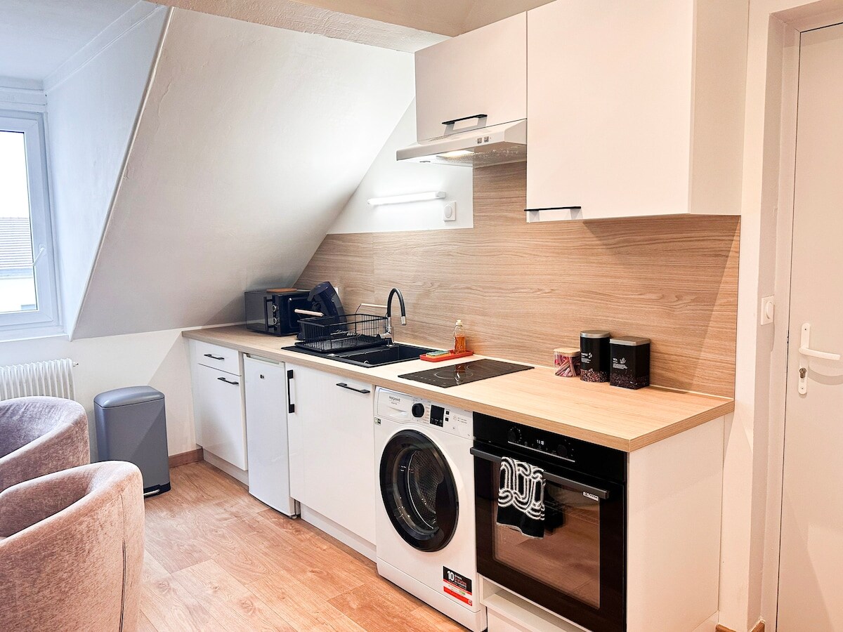 Prekrasan studio od 33 m2 u centru grada. 7 dana ili više -20% 28 ili više dana -30% - Potpuno renoviran, vrlo svijetao, unakrsna svjetla i previše opremljen smještaj. - Doručak je uključen za vaše prvo noćenje. - Kišobran 👶🏻 - Netflix - Optički internet - Smješten u mirnoj uličici, u jednom smjeru, zalijepljen za centar grada, kao i dvorac. - Uličica s plaćenim parkingom i besplatnim parkingom u dvorcu udaljenom 100 m. -Footed: 2 minute od dvorca i centra grada. 10 minuta od stanice