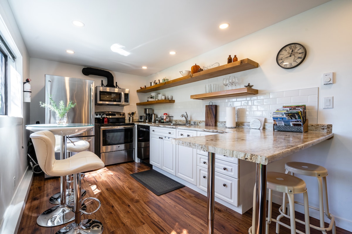 Dobrodošli u naš udobni, umjetnički studio u Duncanu, Cowichan Valley. Bilo da ste ovdje da se opustite ili istražite, to je savršena baza. Apartman se nalazi pored našeg doma, s potpunom privatnošću. Uživajte u terasi, visećoj ležaljci i privatnoj masažnoj kadi tokom cijele godine. Unutra je potpuno opremljena kuhinja s radnim površinama od granita, asortimanom propana i frižiderom. Može spavati četiri osobe s bračnim krevetom Murphy i bračnim krevetom na sprat, oba s organskom posteljinom. Udobno se smjestite uz podno grijanje, rustikalni kamin i klima-uređaj za ljeto.