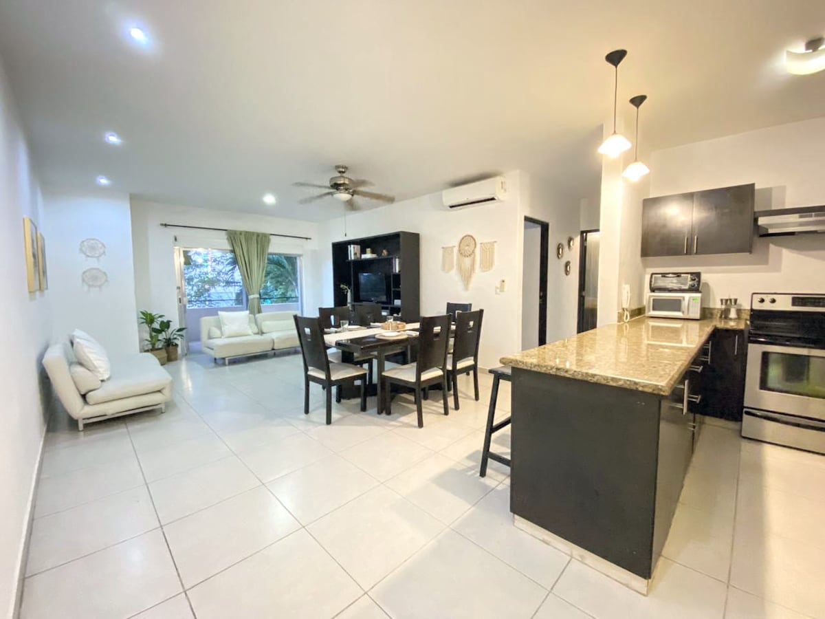 Pobjegnite u naš luksuzni dvosobni stan u srcu Cozumela! Sa zapanjujućim terasama, modernim dnevnim boravkom i visokokvalitetnim sadržajima, ovaj stan je savršeno mjesto za opuštanje i uživanje u miru na ostrvu. Opustite se ispred televizora ravnog ekrana, večerajte za elegantnim stolom za šest osoba ili pripremite vlastite obroke u potpuno opremljenoj kuhinji. Naše udobne spavaće sobe imaju bračne krevete, privatne terase i luksuznu posteljinu za miran san.
