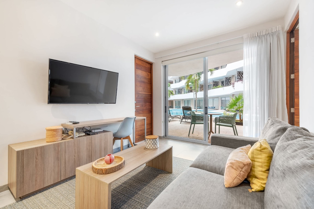 Hermoso departamento vacacional. Totalmente amueblado y equipado, planta baja A 10 minutos de las playas más cercanas y de la tan famosa 5/a avenida A 45 minutos de cancun 📌Cocineta integral equipada, también cuenta con freidora de aire 📌 Baño con inodoro con bidet 📌Aire acondicionado de 2 toneladas 📌Alberca 📌Vigilancia 📌Lavadora o se puede ofrecer servicio de lavandería con recolección de ropa a puerta del departamento. 📌Para uso de estacionamiento revisa reglas de la casa.