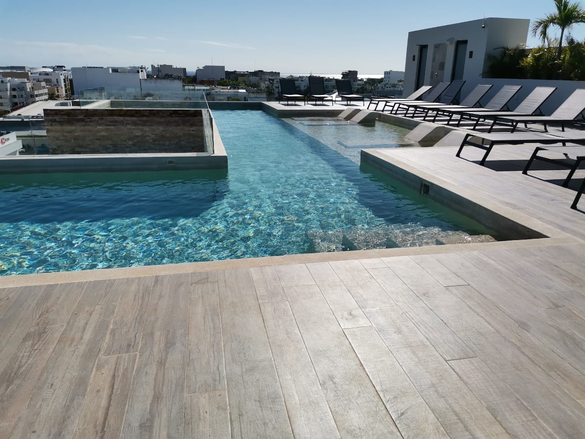 Ovaj smještaj ima stratešku lokaciju u srcu Playa del Carmen: 4 bloka od poznate Quinta Avenide, tako blizu plaže da možete prošetati i samo blok od supermarketa. To je vrlo sigurno područje gdje ćete pronaći restorane i sve vrste usluga samo nekoliko koraka dalje. Ima prekrasan bazen na krovu s pogledom na Karipsko more, teretanu i prostor za roštilj u zajedničkom prostoru zgrade. A/A, kuhinja, TV i Wi-Fi u stanu.