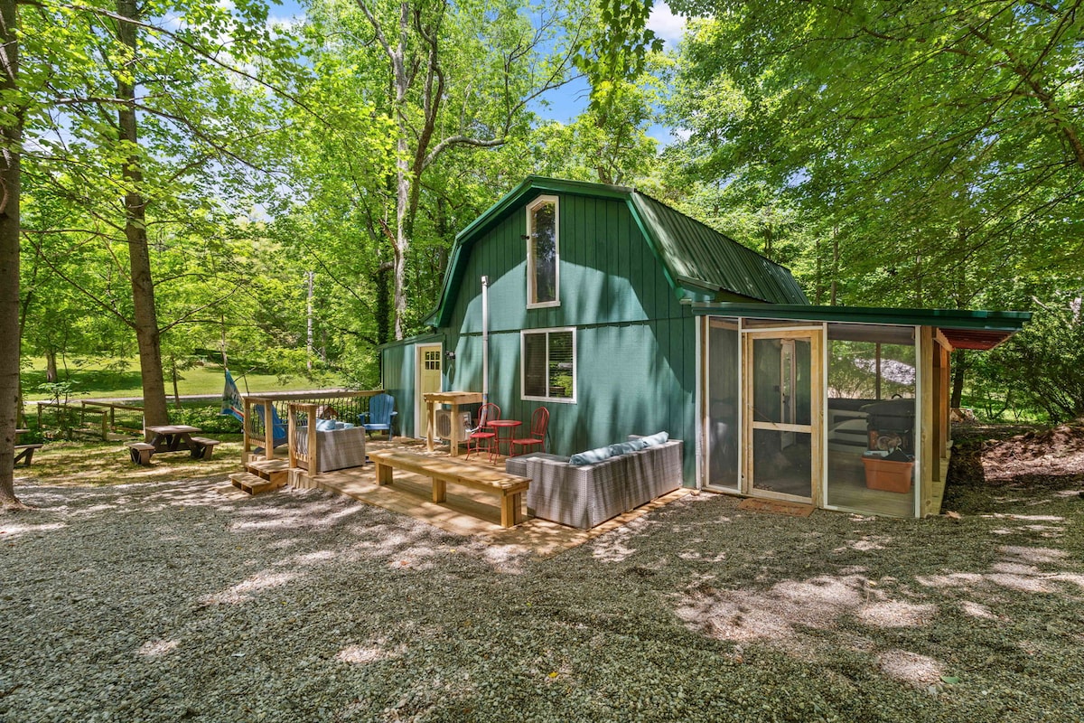 Novouređena brvnara s novim jastucima, posteljinom i peškirima. Drvena nekretnina pored potoka. Uživajte u skrivenoj prednjoj verandi ili stražnjoj terasi s 14-stopskim Swimspa, ognjištem i roštiljem u mirnom šumovitom okruženju. Besplatna propusnica za državni park štedi $ 7 dana. Majstor u prizemlju s bračnim krevetom. 2 bračna kreveta u spavaćoj sobi u potkrovlju. Električni kamin s 5 postavki, klima uređaj/grijanje, brzi Wi-Fi/internet, SMART TV s Bluetooth zvučnom trakom, Direct TV, perilica/sušilica. Ledomat. UVIJEK NUDIMO RANI DOLAZAK I ODLAZAK KADA JE DOSTUPAN.