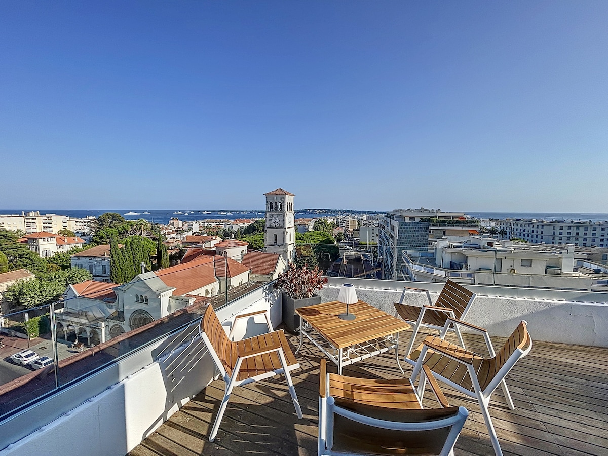 A few minutes from downtown Cannes and the beaches of the Croisette, superb duplex apartment that can accommodate up to 6 people with a breathtaking sea view terrace. Distributed on 2 levels, the apartment is composed of - on the lower floor, a living room with open kitchen, 2 bedrooms & 2 bathrooms - on the upper floor, a 3rd bedroom opening onto a panoramic sea view terrace Renovated in 2020 and decorated with taste, it will delight the most demanding travelers. Welcome to Olam Properties