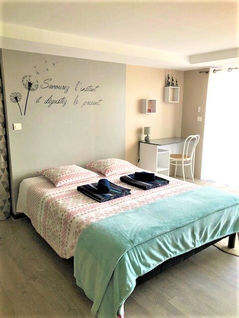 Dobro došli u studio Doux, Nalazi se u prizemlju mog mirnog doma, s privatnim pristupom vrtu 🌳 Klima uređaj Parking mjesto 🚗 Imate bračni krevet, zajedno s kaučem na razvlačenje koji može primiti još dvije osobe. Jedna opremljena kuhinja i jedno kupatilo sa WC školjkom. Ukusno uređen, volio bih vas ugostiti u svom studiju. 🚲 Dostupno je sklonište za bicikle i ograđeni vrt Sef za ključeve za zaseban dolazak Kućni ljubimci nisu dozvoljeni