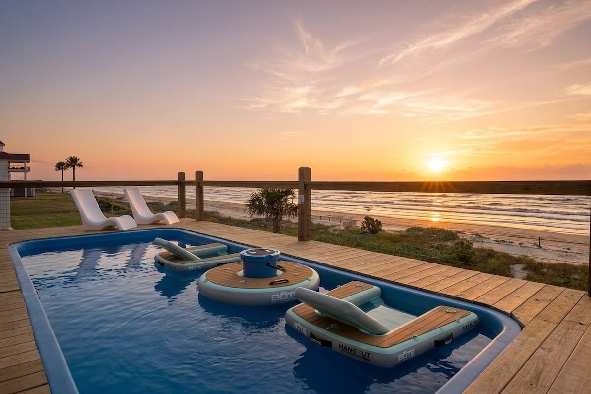 Prošetajte do plaže za 1 minutu. Pogled na plažu, LED masažna kada za 7 osoba, velika terasa za 12 osoba, ognjište i prostrano dvorište od pola hektara. Kuhajte vani na Blackstoneu, smokeru/roštilju ili Breeo rešetki. Vanjski tuš, brzi Starlink WiFi, pametni televizori, mašina za pranje/sušenje veša, parking i univerzalni punjač za električna vozila nivoa 2. Potpuno opskrbljen smještaj u Crystal Beachu, prikladan za porodice i kućne ljubimce.