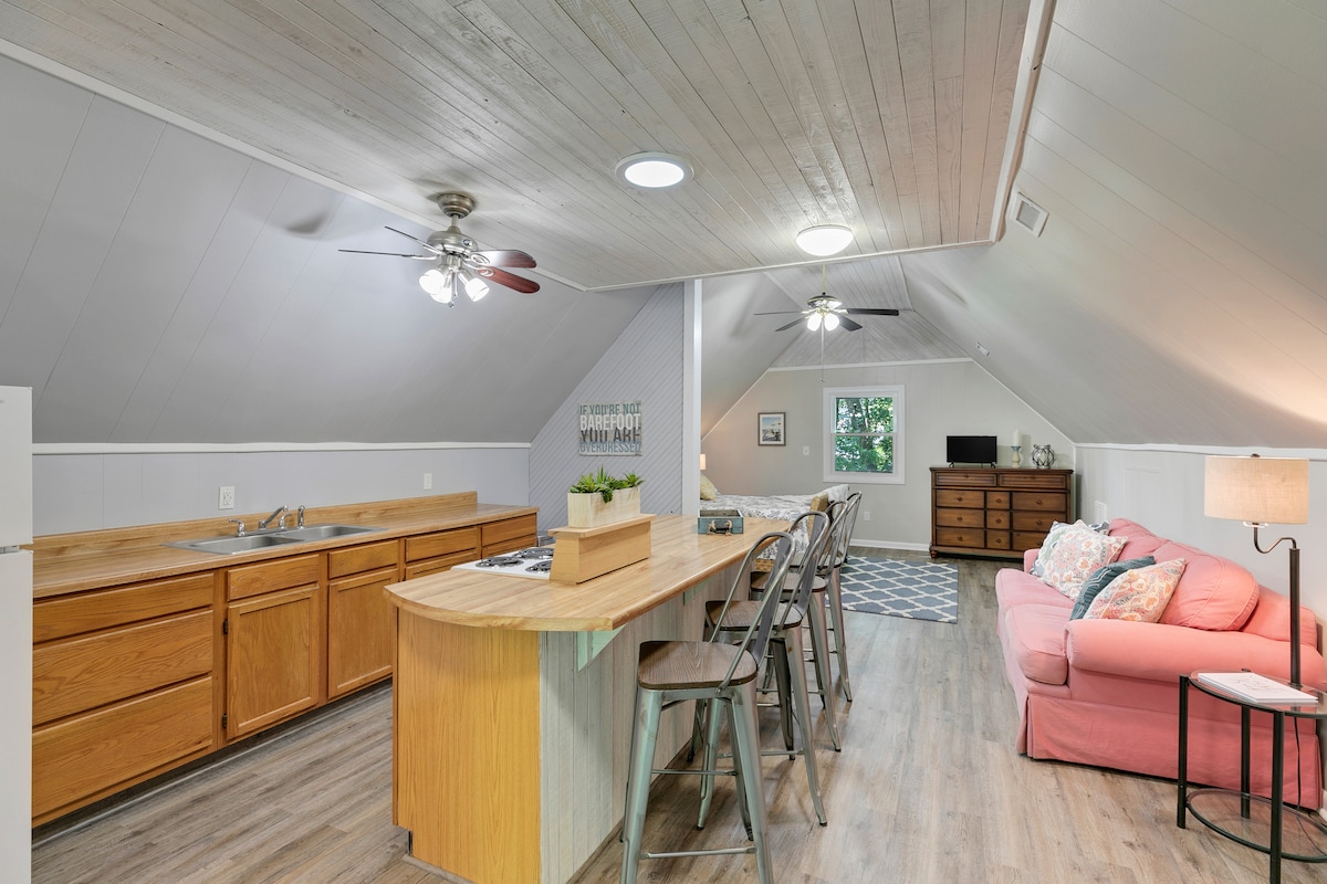 Lagano prozračno potkrovlje sa stropom katedrale. Čajna kuhinja, tanjiri, pribor za jelo, stakleno posuđe, šolje, s mikrovalnom pećnicom, frižider, Kuerig aparat s kafom i vrhnjem. Bar za doručak s 2 stolice za jelo. Privatni ulaz, privatno kupatilo, TV ravnog ekrana od 55inča s direktnim TV-om i Wi-Fi mrežom. Vanjska mini terasa će imati plinski roštilj i stol i stolice. Mala oaza u kojoj možete uživati i opustiti se. Prikladno za kućne ljubimce. Plinski roštilj će biti isključen za zimu od decembra do marta zbog opasnosti od požara.