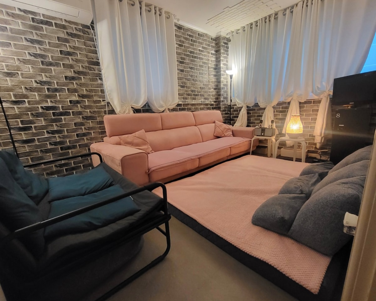 Prostran prostor, odličan za boravak više ljudi zajedno, centralno smješten (u blizini centra grada). Možete uživati u pansionu i kampu na krovu. * Kuća ima ukupno oko 50 pjonga, uključujući potkrovlje, dnevni boravak, kuhinju, veliku sobu, malu sobu i dva toaleta. * Vrijeme dolaska je 16:30, a vrijeme odlaska je 11:30. (Možete ostaviti svoj prtljag od 1: 00 h na dan) * Na raspolaganju su dva parkirna mjesta. * Na krovu kampa za sva godišnja doba nalaze se glamping šatori, grijači, klima-uređaji itd. * Nakon 23 sata budite tihi izvan krova, terase, ulaznih vrata i oko zgrade. * Pazite da ne bude buke između katova u kući ispod nakon 23 sata.(Koristite papuče, suzdržite se od buke ili pjevanja) * Životinje osim ljudi nisu dozvoljene. * Dostupni su projektori i zasloni snopa. * Električni kamini i indukcije dostupni su na krovu kampa. Mogu se koristiti i velike rešetke na drveni ugljen.(Roštilj na drveni ugalj ima dodatni trošak od 30.000 vona)