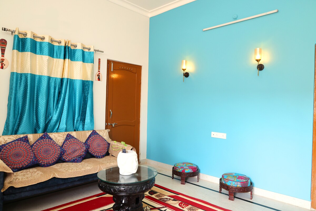 Dobro došli u svoje udobno utočište u Jodhpuru! S tri prostrane spavaće sobe i dnevnim boravkom na prvom spratu, svaka spavaća soba ima udoban bračni krevet i privatno kupatilo. Uživajte u pristupu potpuno opremljenoj kuhinji i balkonu ispunjenom bujnim zelenilom. Smješteni u mirnom području, samo 7,2 km od željezničke stanice, 10 km od aerodroma i 6 km od centralnog područja Jodhpura i tvrđave, doživjet ćete pravi domaći boravak u gradu za svoju porodicu i prijatelje.