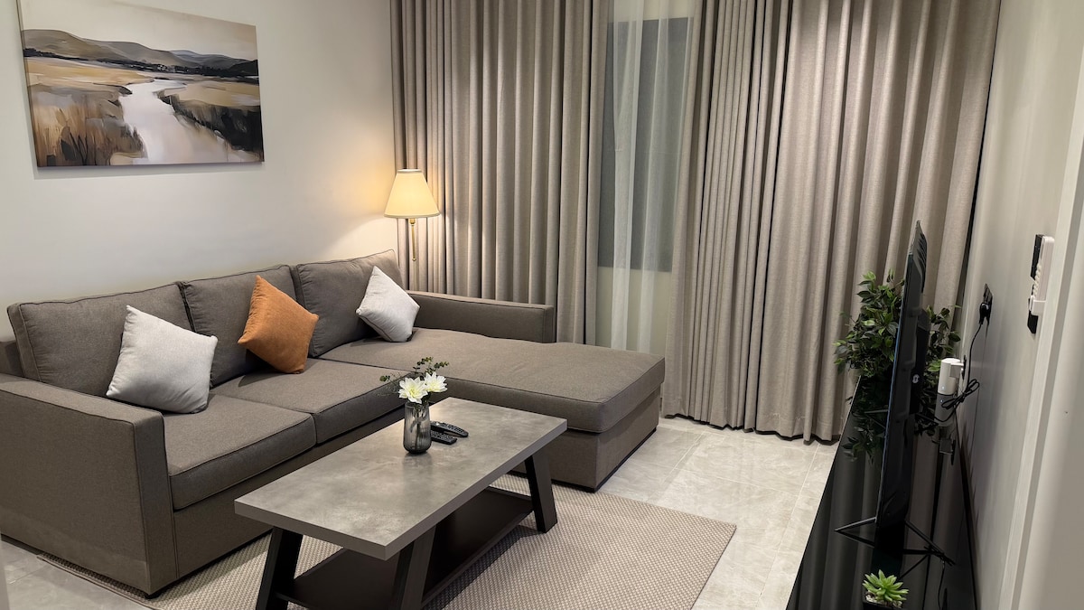 Dobro došli u naš elegantni studio apartman u Khobaru. Ovaj moderni smještaj je savršen za putnike koji putuju sami ili parove koji traže udobnost i zabavu. Studio ima udoban krevet i kauč, dobro opremljen kutak za kafu i ormarić. Uživajte u omiljenim emisijama na 60-inčnom pametnom TV-u. Bilo da pratite svoju omiljenu seriju ili uživate u filmskoj večeri, zabava vam je na dohvat ruke. Instaliran je brzi svjetlovodni internet!