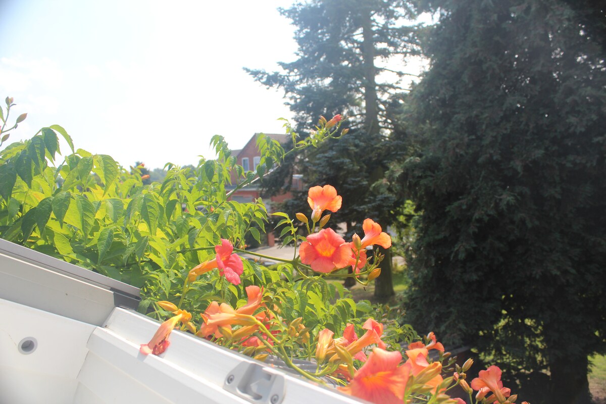 Nudim vam mali ograđeni stan na 2. spratu moje kuće. Na 56 m2 nalazi se 1 spavaća soba, kuhinja, dnevna soba s trpezarijom, malo kupatilo i sunčana lođa. Imat ćete besplatan pristup kroz stepenište, tako da možete dolaziti i odlaziti kad god poželite. Objekti za kupovinu i restorane na pješačkoj udaljenosti. Plaža Falkensteiner s terenom s visokim užadima i mini golfom je blizu, stanica javnog prevoza 2 min hoda, pristanište Fördedampfer 5 min. Pješačka udaljenost. Radujem se vašoj posjeti
