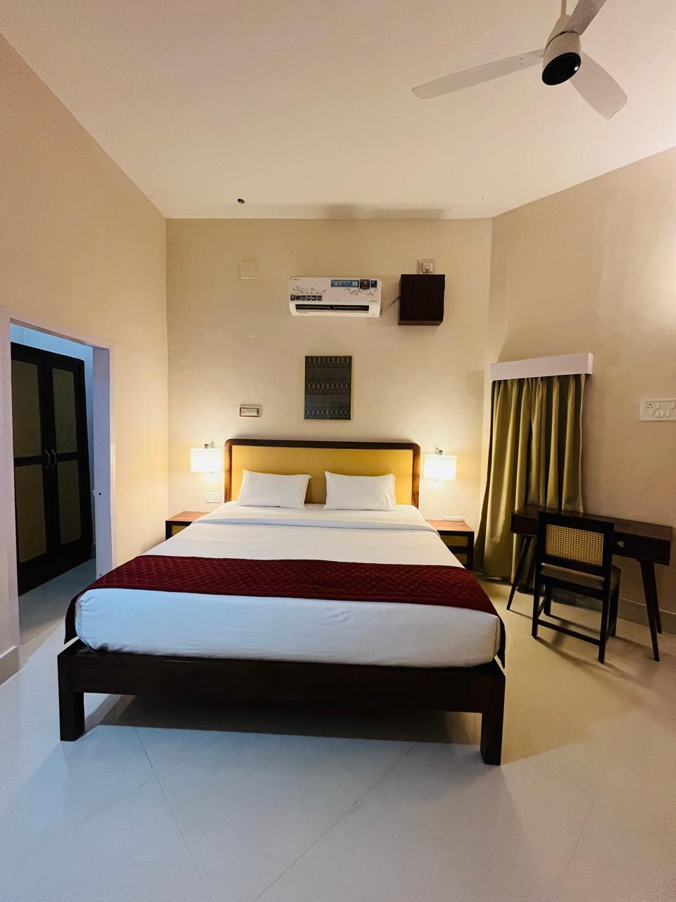 It’s a cozy and thoughtfully designed space with a charming sloped roof and minimalist interiors. Furnished with a comfortable bed, a compact kitchenette with a breakfast bar, and a private bathroom, it's designed for a relaxed, homely stay. The patio offers a sitting area, BBQ facilities, and space to stretch, unwind, or enjoy a quiet yoga session. It also frames lovely views of Gandhi Mandap, a nearby hillock that adds a sense of peace and quiet charm to the setting.