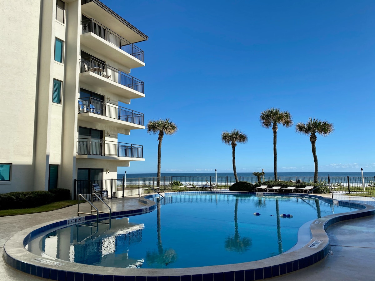 Enjoy our Heated indoor pool We are located on Daytona Beach a 1 minute walk through the pool area to be on the beach. With open pool Netflix Included, Experience our newly renovated King room studio, large balcony with amazing beachfront views it feels like you are on a cruise ship over the ocean. We have all kitchen items needed for cooking and we provide Coffee, cream, sugar .We provide all linens and towels and Beach towels and beach chairs.