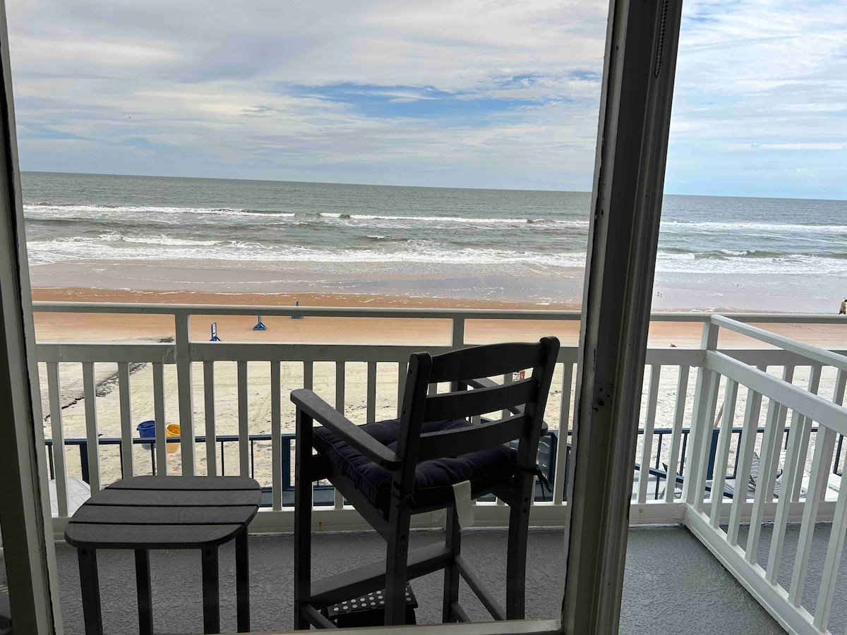 We are located on Daytona Beach a 1 minute walk through the pool area to be on the beach POOL IS OPEN AND INDOOR POOL IS OPEN Kick back and relax in our newly remodeled calm and stylish space. we have a full size refrigerator, you will fall in love with our balcony views. we have all pots and pans and kitchen supplies. all linens and beach towels included. we have 1 king bed and a futon couch big enough for 1 adult or 2 small children