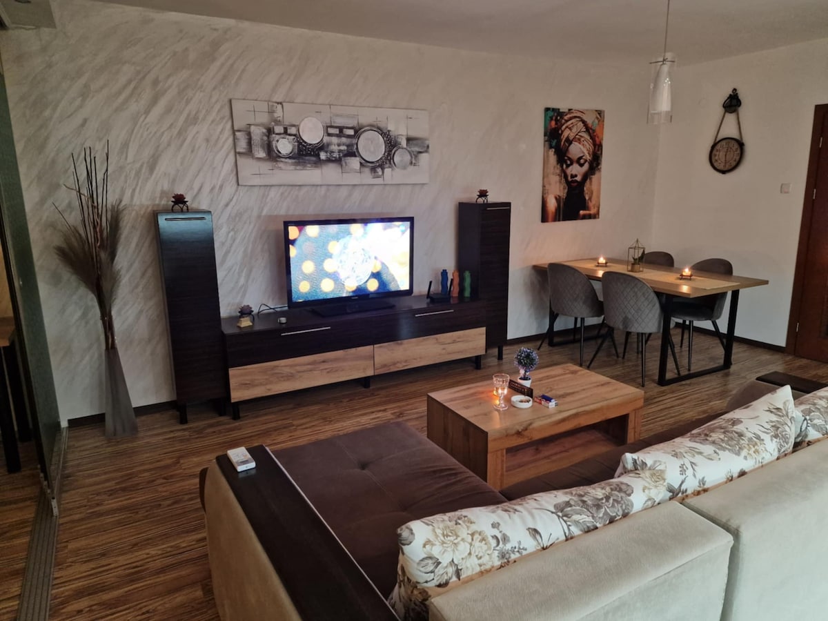 Odsjednite u potpuno novom, modernom stanu u mirnoj aristokratskoj ulici u srcu centra Haskova, samo 2 minute od pozorišta. Kratka šetnja vas vodi do legendarnog spomenika Bogoroditsa i najljepšeg parka Haskovo sa zadivljujućim pogledom. Elegantan, prostran i potpuno opremljen za kraće ili duže boravke, stan nudi plinsko grijanje, klima uređaj, stalnu toplu vodu i izuzetno brz internet. Čeka vas savršeno utočište za udobnost i praktičnost!