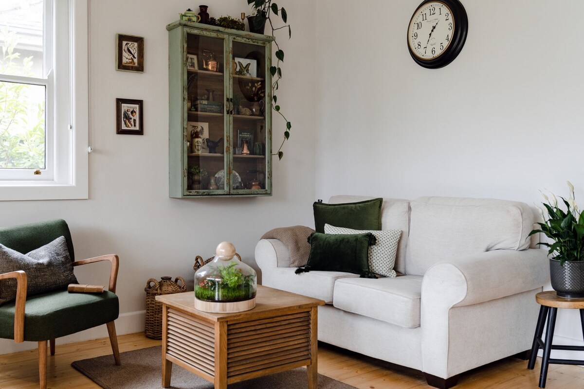 Retro jedinica od cigle iz 70-ih, 1 od 3. 2 SPAVAĆE SOBE. Eklektičan elegantan enterijer. Bračni krevet (širine 125–149 cm) i bračni krevet (širine 150–179 cm) (mogu se podijeliti na 2 XL kreveta za jednu osobu) Čvrsti i mekani jastuci, javite mi svoje preferencije. Beskrajna topla voda. Odvojeni toalet. Potpuno opremljena kuhinja za dugoročne goste. Prostrani salon i trpezarija. Sunčano dvorište okrenuto prema sjeveru s roštiljem Nalazi se u predgrađu Ballarat Central. 15 min hoda do bolnica, 30 minuta hoda do CBD-a. 5 minuta hoda do kafića Cornerstone Cafe i lijepe suvenirnice u susjedstvu. 1–2 minute hoda do autobuske stanice