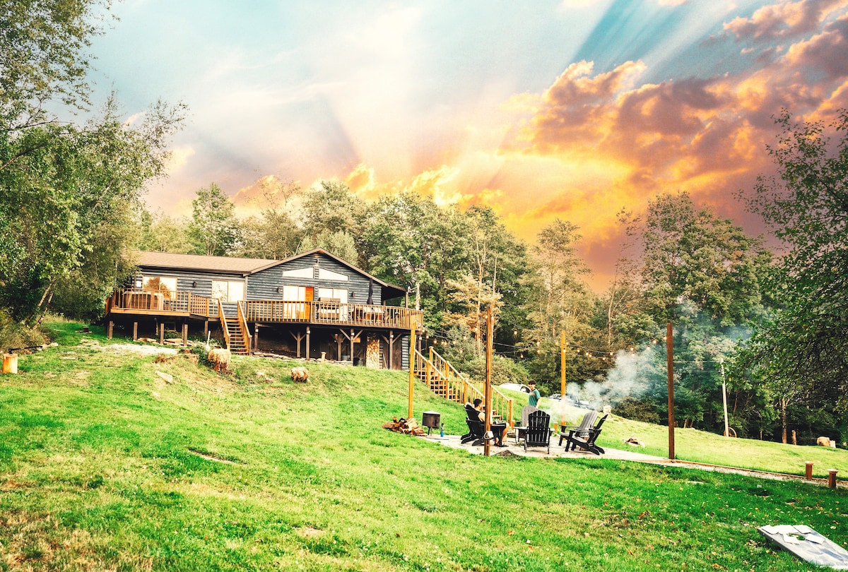 Smještena u Catskillsu, okružena valovitim brdima, farmama javora, pogledom na planine i privatnim jezerom, ova seoska kuća nudi rustikalni šarm i moderan luksuz. Opustite se pored logorske vatre, kućice na drvetu ili uronite u masažnu kadu i uživajte u panoramskoj sauni u bačvi. Možete istražiti obližnje antikvarnice, slikovite staze, pridružiti se bejzbolskim ligama Cooperstowna. Povedite porodicu ili prijatelje na nezaboravan odmor od 4 sezone u ovom prekrasnom i mirnom utočištu.