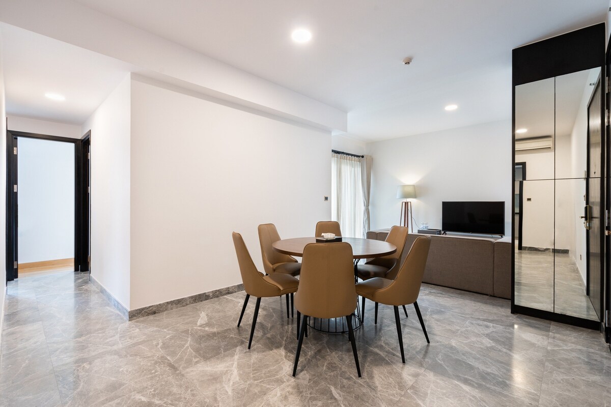 Stan je lijepo dizajniran u stilu Wabi Sabi koji se nalazi u zgradi D1Mension Residences, centru Distrikta 1, u umjetničkom stilu, posebnim objektima odmarališta na visokom nivou_spa kupatilo jezero_završena soba, teretana_soba za sastanke, privatna radna soba, vrtni akvarijum, piza 4’ desno, vrtni prostor za roštilj, prostor za igru za djecu, veliki salon, svi prozori i balkoni spavaće sobe su prozračni, stan je jedinstven, luksuzan, elegantan