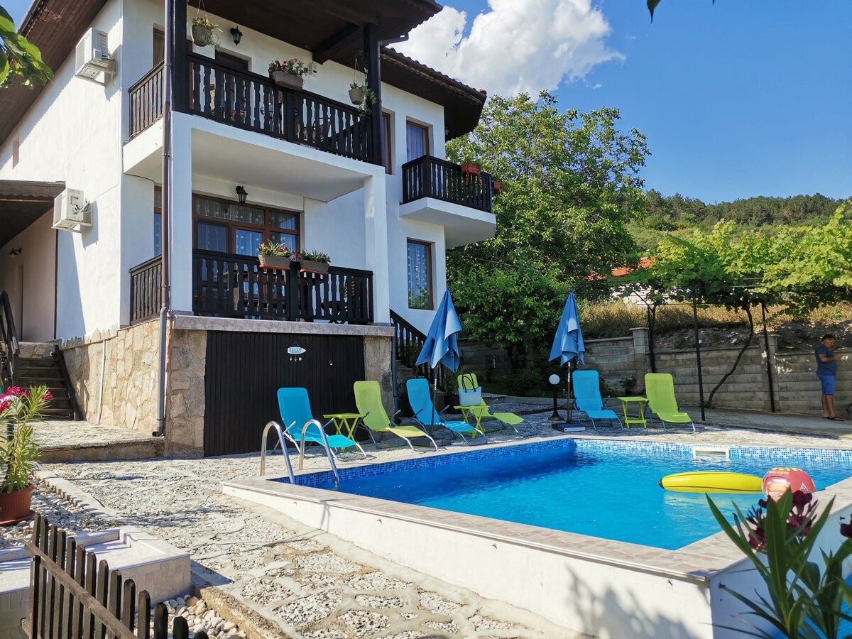 Uživajte u odmoru u našoj vili u Fish-Fish do Balchiku, samo 10 minuta hoda od plaže. Vila nudi 5 spavaćih soba za 13 osoba, 4 kupatila, dvije terase s pogledom na more, grijani bazen s ležaljkama i sjenicu s roštiljem. Kuhinja je potpuno opremljena i sve sobe su klimatizovane. Imamo ograđeni parking za 2 automobila i dodatna parking mjesta. Kućni ljubimci su dobrodošli. Savršeno mjesto za opuštanje i zabavu uz more!