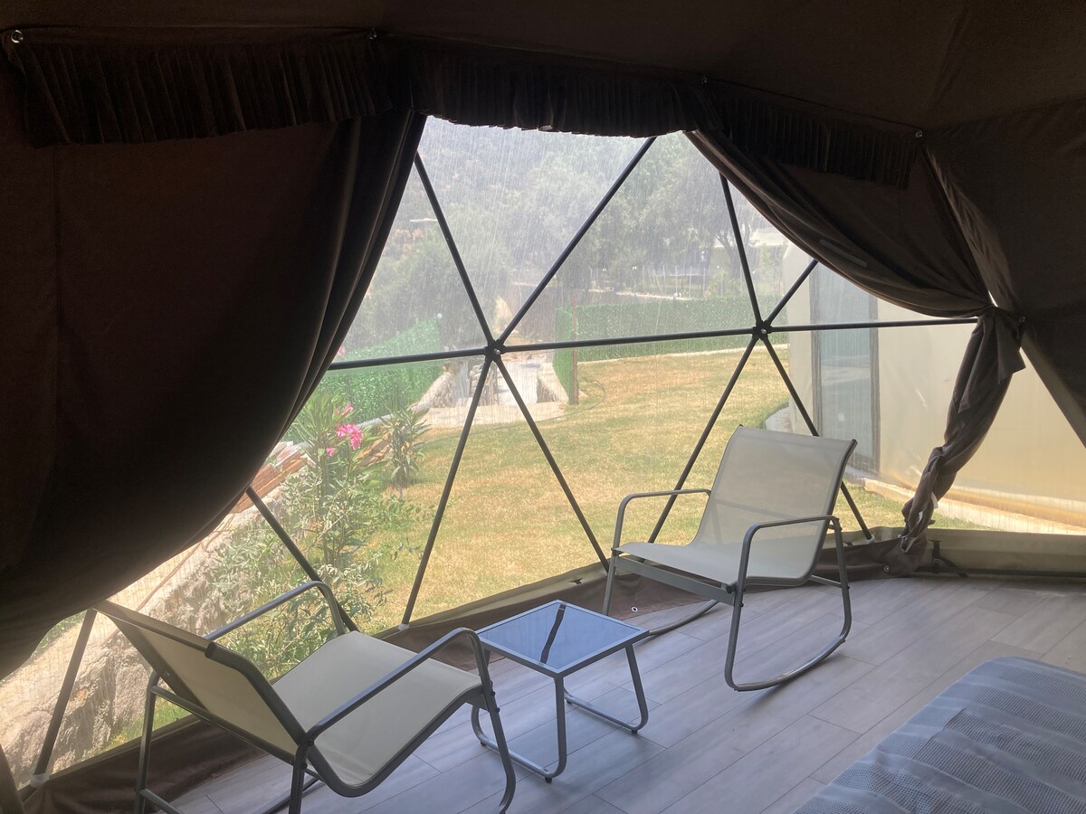 Bodrum'da, doğanın kucağında, Bodrum merkeze 6 km, Yalıkavak Marinaya 6,8 km mesafedeki Dağbelen 'de glamping çadırınızda, kuş cıvıltıları arasında konaklamanın keyfini sürün. Tesisimizdeki 4 çadırın tamamında banyo-wc, klima mevcut. Dilerseniz kahvaltı, yemek, ulaşım, plaj ulaşımı gibi ek hizmetlerimizden faydalanabilirsiniz. Muğla büyükşehir belediyesine ait toplu taşıma araçları ile Bodrum merkezden Dağbelen'e transfer hizmeti mevcuttur. Çadırımızda 1 double ile 1 single yatak mevcuttur.