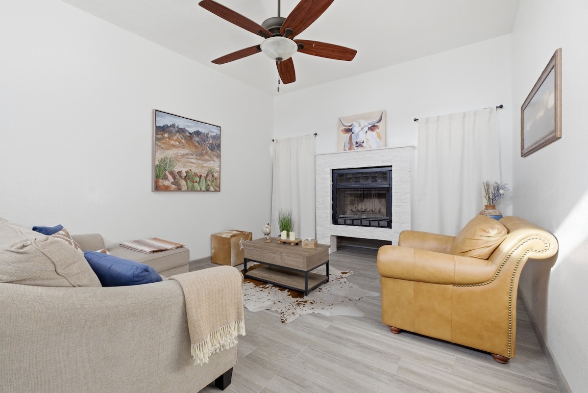 Uživat ćete u boravku u ovoj modernoj kući u nizu i uživajte u čaši vina u natkrivenom dvorištu dok uživate u zalascima sunca u Novom Meksiku. Bez kućnih ljubimaca, bez dima. Potpuno opremljena kuhinja sa svime što vam je potrebno za pripremu obroka. Prostrane 2 spavaće sobe , 2 kupatila. Pametni televizori s Rokuom, pristup garaži, veš mašini/ sušilici. U prijateljskom mirnom kvartu s minimalnim prometom. Jednostavan pristup međudržavnim cestama 10, 25 i autoputu 70. U blizini su restorani, kino, shopping.