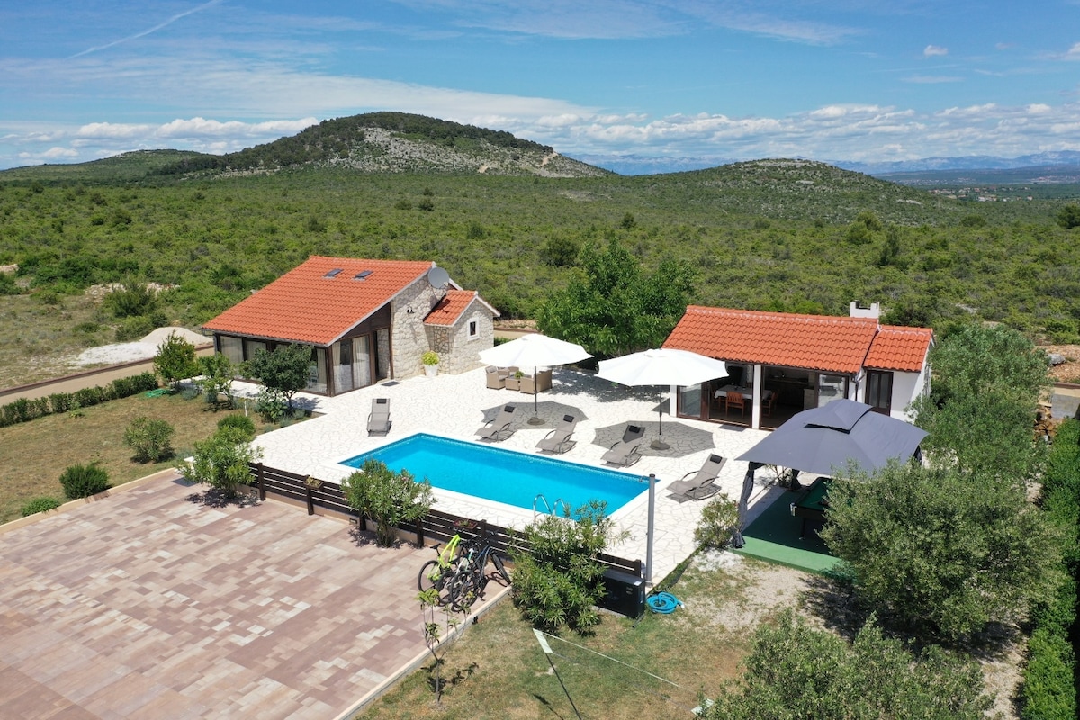 Ova prekrasna vila s grijanim bazenom, masažnom kadom i saunom smještena je na zabačenom i skrovitom pejzažu s pogledom na dolinu koji oduzima dah Grijani bazen od aprila do novembra Odlično mjesto za opuštanje i polazišna tačka za istraživanje regije i Hrvatske! Udaljenost od grada Zadar je udaljen 28 km (aerodrom 20 km) Šibenik je udaljen 50 km Split je udaljen 125 km (aerodrom 99 km) Udaljenost od atrakcije Plitvička jezera udaljena 125 km Krka udaljena 45 km Kornati udaljeni 30 km