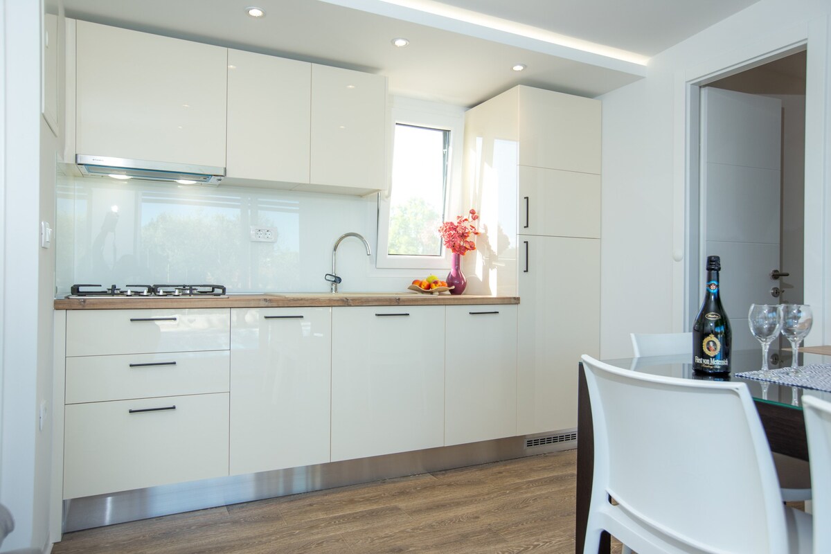 Kuća je udaljena 10 m od mora. Na balkonu apartmani imaju privatnu hidromasažnu kadu za 5 osoba. Ispred kuće, odmah pored mora, nalazi se mali vrt s roštiljem i velikim stolom za 8 osoba gdje možete uhvatiti ljetni povjetarac u prirodnoj sjeni. Na plaži postavljamo naše stolice i suncobrane kako biste mogli uživati u moru i suncu. Ispred kuće je vez za mali čamac ili jet-ski ( do 6 m ). Cijela porodica u ovom mirnom smještaju.