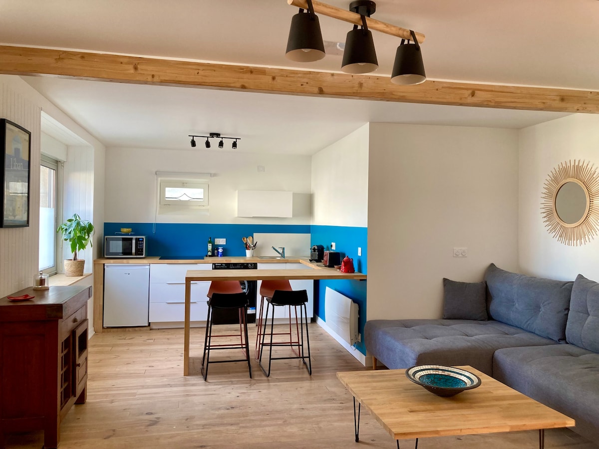 Le studio a été totalement rénové en 2018, par un architecte d’intérieur. Face à la plage Saint-Jean, il a été conçu comme un écrin de mer, avec du bois et des matériaux nobles. Un autre studio similaire, au rez-de-chaussée, est disponible à la location pour les personnes souhaitant venir avec un autre couple. Les 2 studios sont l'un au-dessus de l'autre.