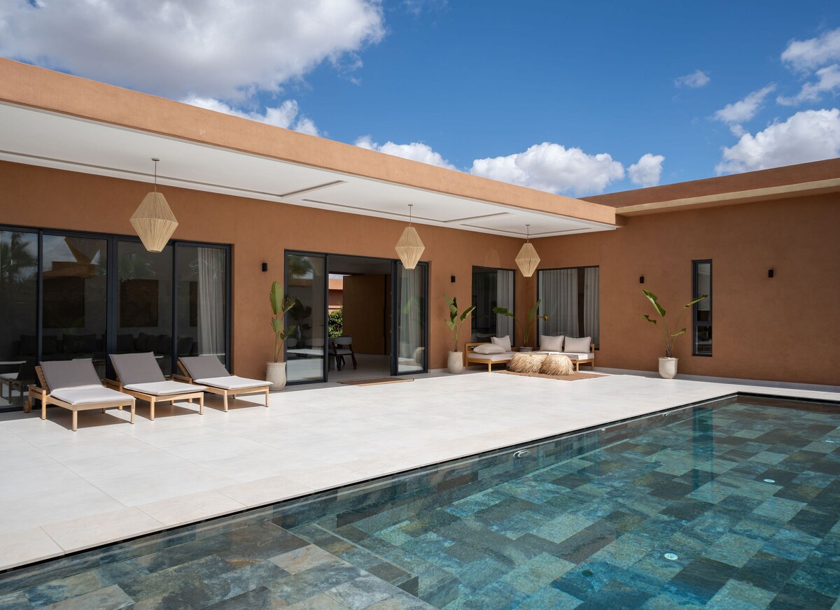 Moderna vila s neometanim bazenom i vrtom sa zadivljujućim pogledom na poznati marokanski atlas. Vila je u potpunosti namještena, sastoji se od opremljene kuhinje, unutrašnjeg dnevnog boravka i trpezarije, kao i 5 spavaćih soba s kupatilom. Vani vas čeka prekrasna terasa s dnevnim boravkom da uživate u bazenu i vrtu. Sve je uključeno: klima uređaj, bazen, Wi-Fi, TV, posteljina, posteljina, čišćenje...