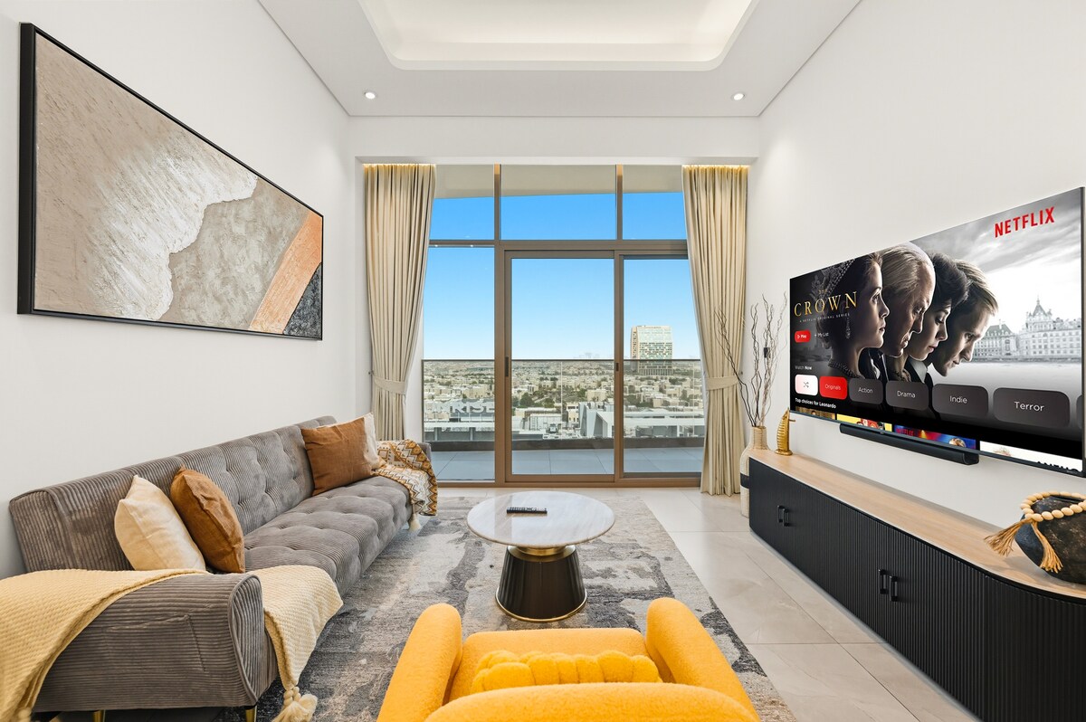 Zakoračite u naš predivan i jedinstveno prostran luksuzni apartman s jednom spavaćom sobom, pažljivo dizajniran da ponudi neusporedivo iskustvo za porodicu od 3 osobe (2 odrasle osobe + 1 dijete), parove (2 odrasle osobe), samostalne putnike ili profesionalce koji rade na daljinu. Ovo nije samo mjesto za boravak; to je utočište osmišljeno da njeguje vaše tijelo i dušu. Od trenutka kada uđete, dočekat će vas elegantan, moderan životni prostor ukrašen vrhunskim završnim obradama i pažljivo osmišljenim detaljima, postavljajući pozornicu za zaista nezaboravnu posjetu Dubaiju.