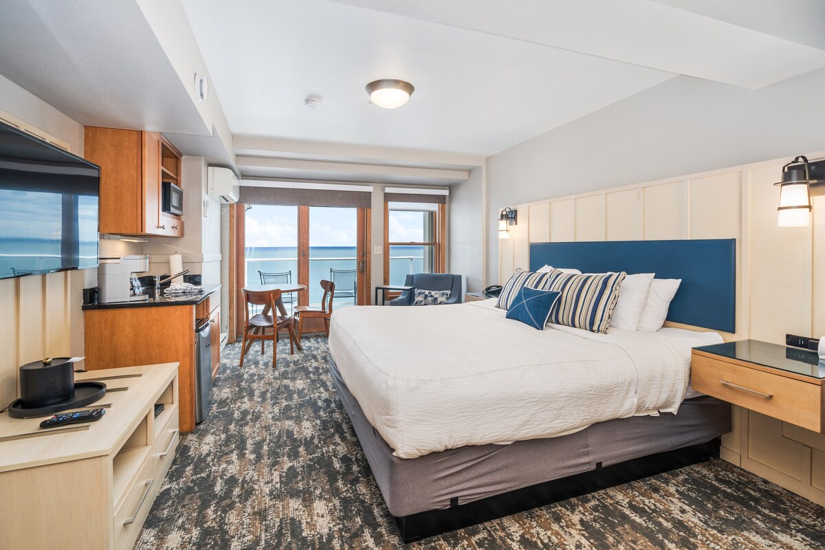 Settle into a modern king studio that feels like a boutique hotel—only better. A handy kitchenette (mini-fridge, microwave, coffee maker) makes quick meals easy, and the cozy fireplace and jetted tub make evenings extra relaxing. No balcony, but you’re steps from Lake Superior in this waterfront unit and minutes to Gooseberry Falls and Split Rock Lighthouse. Enjoy resort perks: indoor pool, sauna, and indoor/outdoor spa. An ideal North Shore base for couples—and yes, your well-behaved pup!