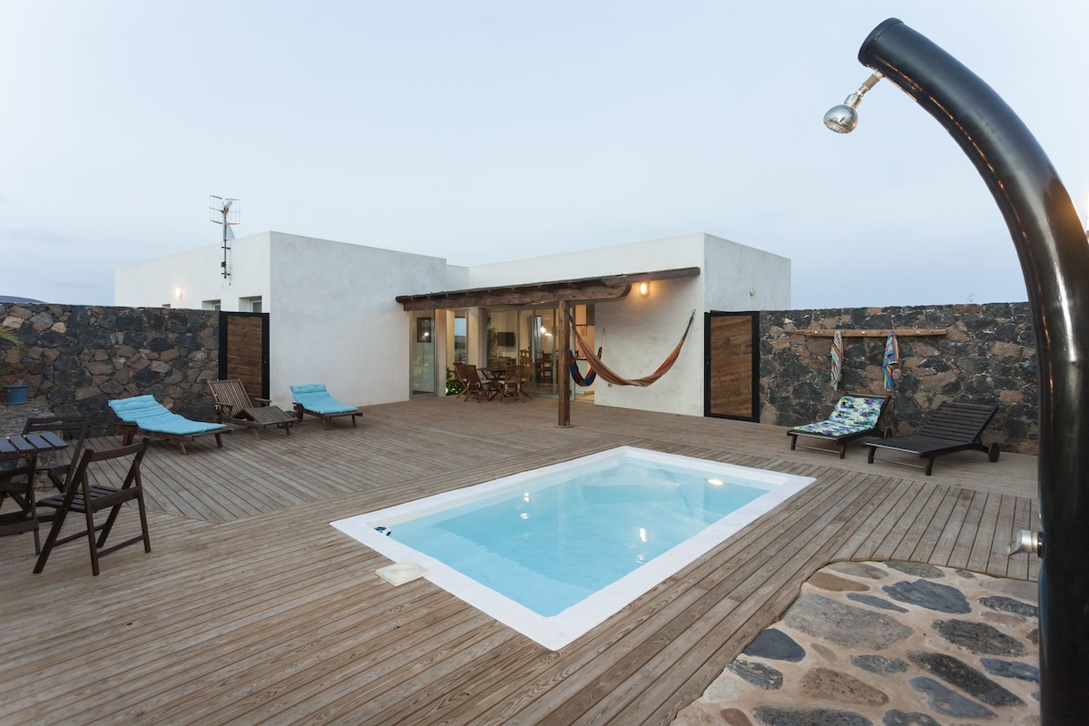 Neonauta Mini, Dizajniran je s izuzetnom ljubavlju prema detaljima i kvalitetu. Namještaj je moderan i sve je spremno za vaše uživanje. Parcela je 1000 m2, a komšije su daleko. Kuća ima potpunu privatnost i pogled na vulkane. Možete uživati u prostoru i tišini. Osjećajte se kao da vam Fuerteventura želi dobrodošlicu.