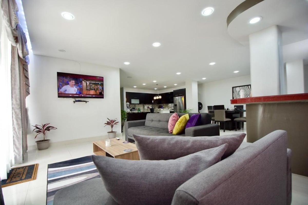 Luksuzni penthouse u zgradi Quo Luxury, nekoliko koraka od hotela Sheraton Wyndham Tryp Guayaquil, bolnice Omni, tržnog centra Mall del Sol, sa zadivljujućim pogledom na Guayaquil iz velikih prozora. 11. sprat, 3 minute od aerodroma. Blizu restorana, banaka, hotela, tržnih centara. 3 velike spavaće sobe s kupatilima i ormarima, dnevni boravak, trpezarija, kuhinja u američkom stilu, 4 kupatila, brz Wi-Fi, privatni parking. Za više od 8 gostiju, dostupan je dodatni krevet. Predvorje, recepcija, bazen, teretana, obezbjeđenje