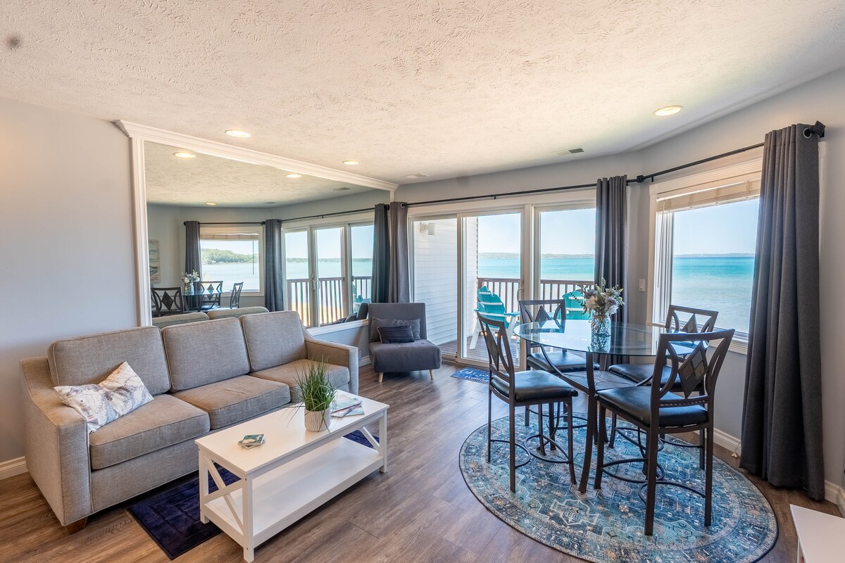7 minuta do konjičkog festivala! Smješten u prelijepom East Bayu u Traverse Cityju, ovo je upravo potpuno preuređeno. Kondominij je na samoj vodi! Nekoliko minuta od centra grada Traverse Cityja, vinarije i još mnogo toga. Uživajte u opuštanju na suncu na 600 stopa privatne pješčane plaže ili iznajmite kajak, skute za vodu ili dasku za veslanje. Ovaj stan u studio stilu je završna jedinica s prekrasnim pogledom na zaljev. Ovaj stan ima nevjerovatan tuš s kišnom glavom i 3 spreja za tijelo!