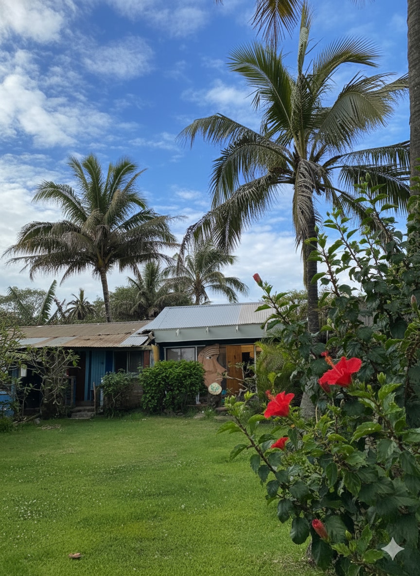 Loin des nuits bruyantes du village, louez votre maison dans un grand jardin calme, fleuri, aux vestiges archéologiques. Les cottages sont décorés de troncs sculptés, peintures et créations d'artistes locaux. Engagés pour un tourisme éco-responsable, Céline, écrivaine, conteuse française et Juan, agriculteur bio rapanui vous accueillent pour personnaliser votre séjour et le rendre unique. Location de voiture à prix préférentiel, tours, conseils. Idéal pour les enfants, le yoga et déconnecter.
