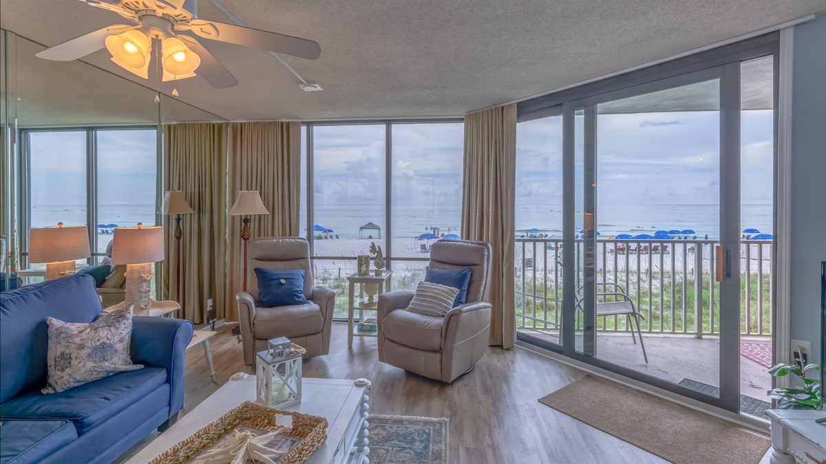 🏝 NAJBOLJE U PCB-u 🏝 Ne može biti mnogo bolje od buđenja uz zadivljujući pogled na okean iz vaše glavne spavaće sobe i zakoračenja pravo na privatni balkon s pogledom na prekrasan izlazak sunca iznad Zaljeva. Započnite dan toplom šoljicom kafe dok uživate u spokojnoj ljepoti smaragdnih voda. Navečer se opustite uz čašu vina dok posmatrate delfine kako elegantno plivaju. Zakoračite direktno na pješčanu plažu bijele boje, raširite stolice i upijte sunce Floride. Savršen odmor