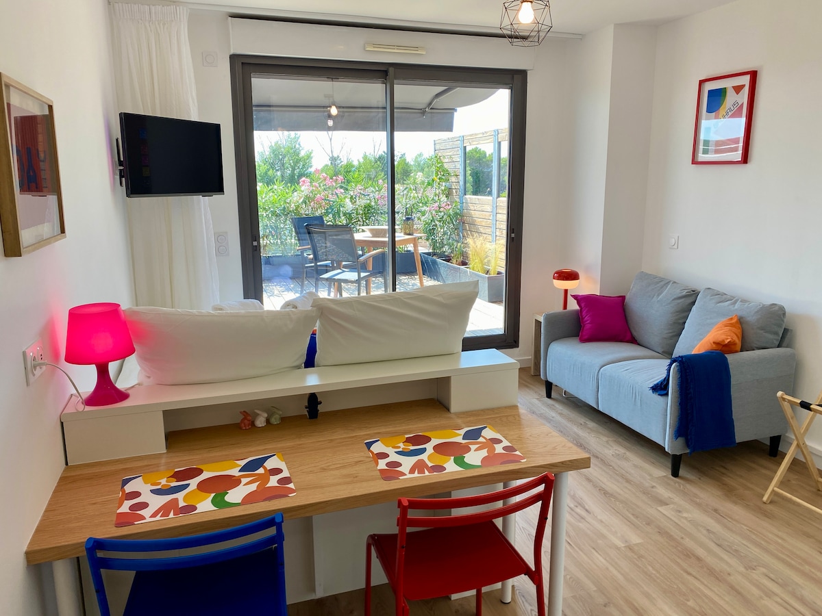 Za vaš odmor, putovanje ili poslovno putovanje u Aix-en-Provence, otkrijte ovaj udoban studio s 3 zvjezdice s lijepom terasom od 12 m², potpuno opremljen, u mirnom kompleksu apart-hotela s bazenom (u sezoni) i besplatnim parkingom. Samostalna prijava. Smješten 2 km od Aix-en-Provencea, do avenije Cours Mirabeau i njene fontane La Rotonde možete stići za samo nekoliko minuta: uživajte u načinu života u Aix-en-Provenceu, njegovim provansalskim uličicama te brojnim trgovima i restoranima.