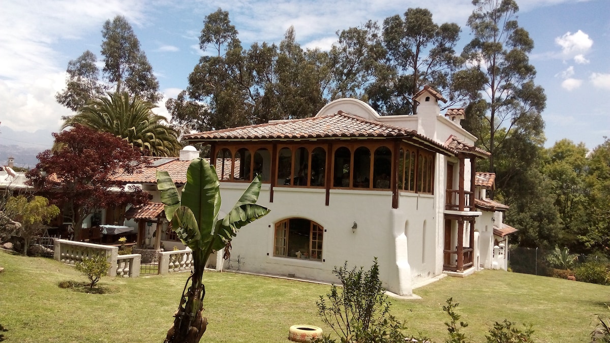 Organska kuća u mediteranskom stilu, okružena voćnjacima i prirodom, 35 minuta od Quita i aerodroma. 2500 metara vrtova, odmorišta, prirodni bazen s toplom vodom, dječji prostor. Idealno za opuštanje i povezivanje s prirodom, uz svjetlovodni internet. Radi sigurnosti svih, prije svake posjete se angažuje profesionalna firma za dezinfekciju. Rezervacijom: Privatni prevoz, čas joge, masaža, parno kupatilo, organska pijaca kod kuće.