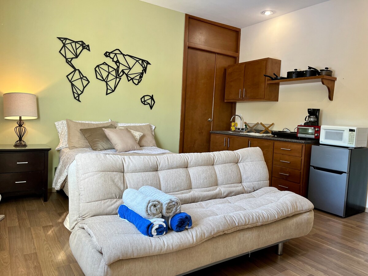 Hermoso departamento🦋 en una de las mejores zonas de La Paz a solo una calle del malecón, rodeado de restaurantes, tiendas, hermosos callejones.☀️ Cuenta con hermosos espacios decorados para que pases unos dias y noches increíbles y tranquilas, con todo lo necesario para que disfrutes de unas lindas vacaciones en compañia de familia y amigos. Disfruta de un rico cafe por la mañana o tarde en nuestra cafeteria belier ubicada en planta baja.