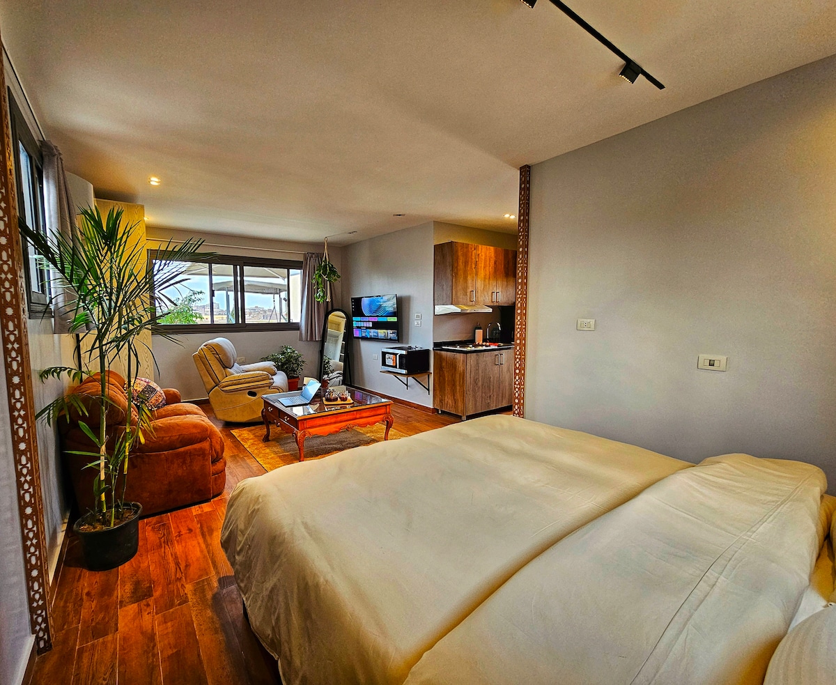 Kompletan stan na prostranom krovu Secret Garden s panoramskim izlascima sunca, plavim nebom i punim mjesecima u centru baštine u Kairu, samo nekoliko minuta hoda od tržnica, turističkih atrakcija i centralne stanice metroa. Ovaj novouređeni stan iz 70-ih je minimalistički, moderan, ali topao, jedinstven dizajnerski prostor u srcu glavnog grada, koji kombinuje i urbane i prirodne elemente mediteranske arhitekture. Kao superdomaćini i umjetnici uvijek dajemo sve od sebe da vaš boravak bude nezaboravan.
