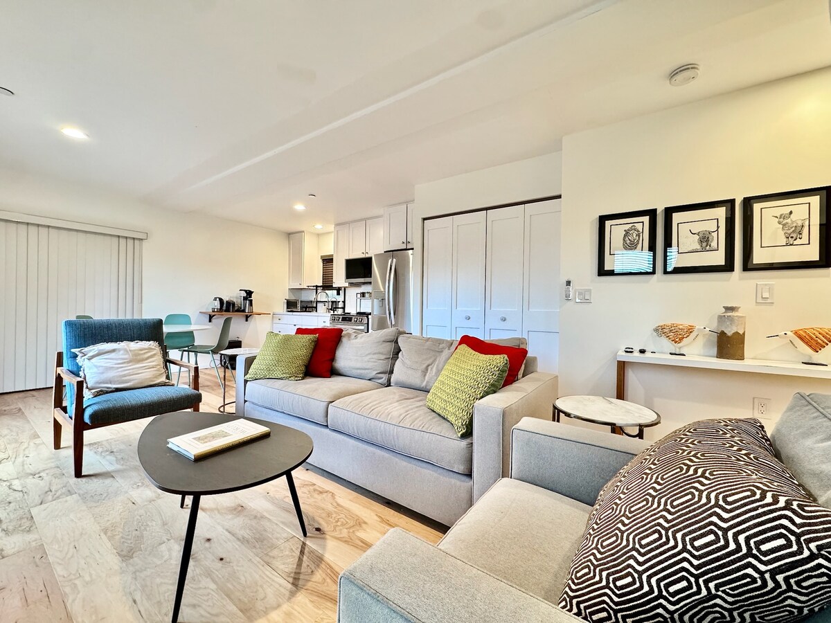 Studio Apt is 650 sq ft, on ground floor of our home with private entry, located on quiet hill on private street, yet only 1 mile from Historic Main St. 1 Queen Bed, 1 dbl size Futon/lounger, seating area, dining table & chairs, Lg Flat Screen & frig. Private bathroom. In the breezeway, we offer a coffee bar w/ microwave, toaster, washer & dryer. Patio w/ table & chairs directly outside the studio & guests have access to large lower deck with picnic table. We accept dogs, can't accept cats.