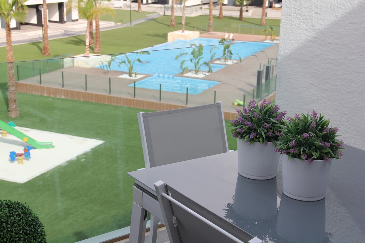Savršena destinacija za vaš odmor u Španiji. Apartman Oasis Beach Relax nalazi se u lijepom i modernom stambenom naselju udaljenom samo 3 km od bijelih pješčanih plaža Costa Blance. Smještaj nudi ograđeni kompleks s privatnim parkingom, velikim bazenom, mini golfom, vanjskom teretanom i spa centrom. Stan s dvije spavaće sobe s bračnim krevetima, dva kupatila, prostranim dnevnim boravkom s potpuno opremljenom kuhinjom otvorenog tipa i velikom terasom s pogledom na vrt. PAMETNI TV + Netflix