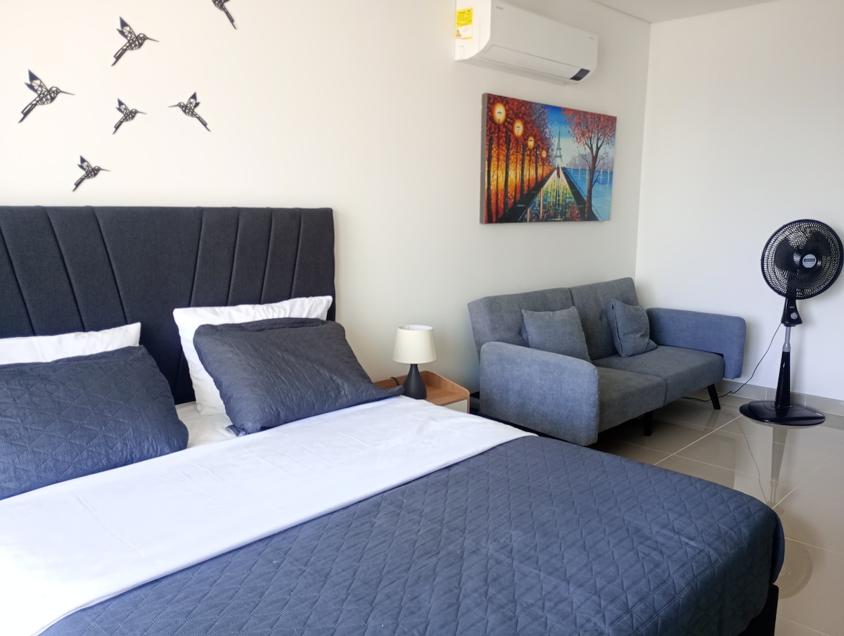 Moderan stan u potkrovlju s pogledom na okean, samo 100 metara od plaže u Rodaderu. Savršeno za 1–3 gosta s prostranim krevetom, kaučem, opremljenom kuhinjom, namjenskim radnim prostorom i moderno uređenim kupatilom. Uključuje nevjerovatne pogodnosti: bazene za odrasle i djecu, kompletnu teretanu, saunu i prostor za roštilj. Uključen je brzi Wi-Fi. Odlična lokacija u blizini restorana, trgovačkog područja i turističkih atrakcija. Vaš savršen bijeg u kolumbijskom Karibima!