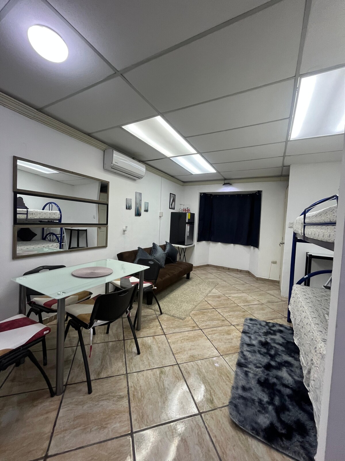 Udoban PRIVATNI mini apartman s 2 kreveta, smješten u centralnom, mirnom i sigurnom području San Salvadora. Nalazi se unutar stambenog i privatnog doma, ali sa zasebnim ulazom Vlastito kupatilo, klima-uređaj, Wi-Fi, 50-inčni Smart TV s Netflixom, ormar, mali frižider, vanjski parking itd. Objekat se nalazi u blizini stadiona Cuscatlán i 10 minuta od trgovačkih centara kao što su La Gran Vía, Multiplaza, El Salvador svijeta i 5 minuta od Starbucksa, restorana, apoteka itd.