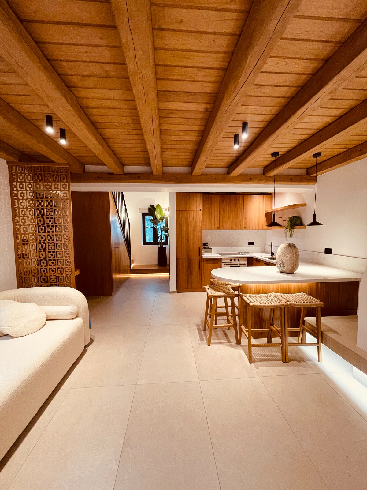 Tucked into the peaceful hills of Volimes, Zakynthos, Nousa Villas offer a secluded escape with panoramic views of the Ionian Sea. Designed with understated luxury and Mediterranean elegance, these stone-built villas are perfect for couples, small families, or anyone craving space, nature, and serenity. Each villa is thoughtfully designed to combine comfort, privacy, and style. Inside you’ll find high ceilings, natural textures, and beautiful light throughout the open living and dining areas.