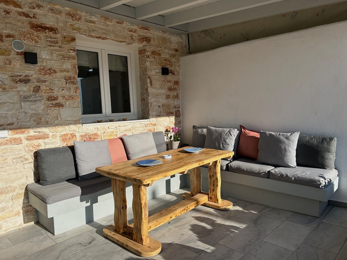 PLAVA MAISONETTE je kuća na tri nivoa sa 3 spavaće sobe (bračni krevet, dva kreveta za jednu osobu, tri kreveta za jednu osobu), 2 kupatila, jednom planom kuhinje. Može primiti najviše 7 osoba. Na gornjem spratu možete uživati u pogledu na luku Paros, a u prizemlju ćete pronaći potpuno opremljenu kuhinju s dnevnim boravkom oko kamina. Također, možete uživati u našem trijemu s direktnim pristupom našem vrtu